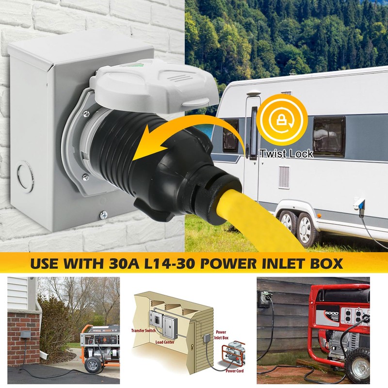 - RV Generator Adapter Cord: The L14-30R to 14-50R adapter cord help draw power from the L14-30 industrial generator or an older circuit outlet to power RVs, electric vehicles, welders, and other equipment.