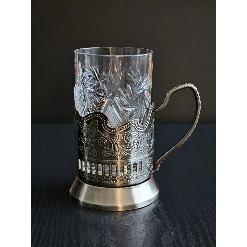 ✨This elegant8.5 oz (250 ml) tea glass features a delicately cut crystal design,securely held in a traditional ornate metal podstakannik (glass holder). A perfect blend of function andnostalgia!