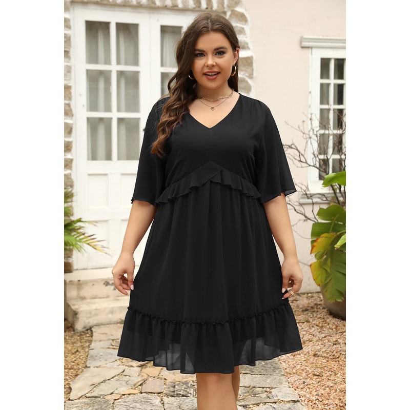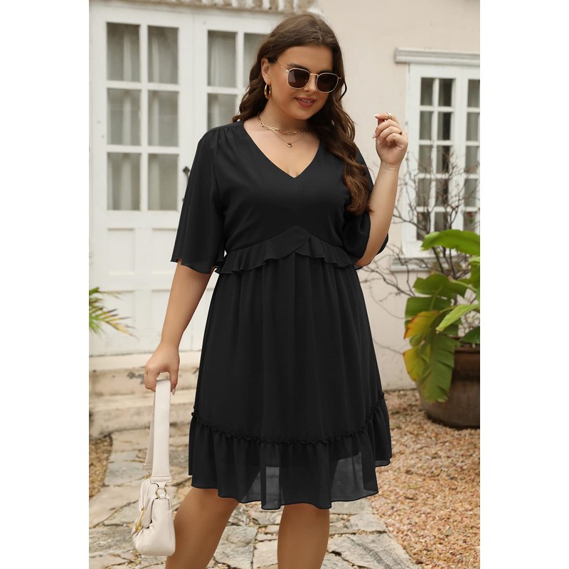 - Features: The print pattern is cute and adorable of this plus size swing babydoll dress, the v-shaped plunging neckline with the frilly fabric around it, and the loose ruffle sleeves are very flattering and hit the elbow, smocked waist, mini length.