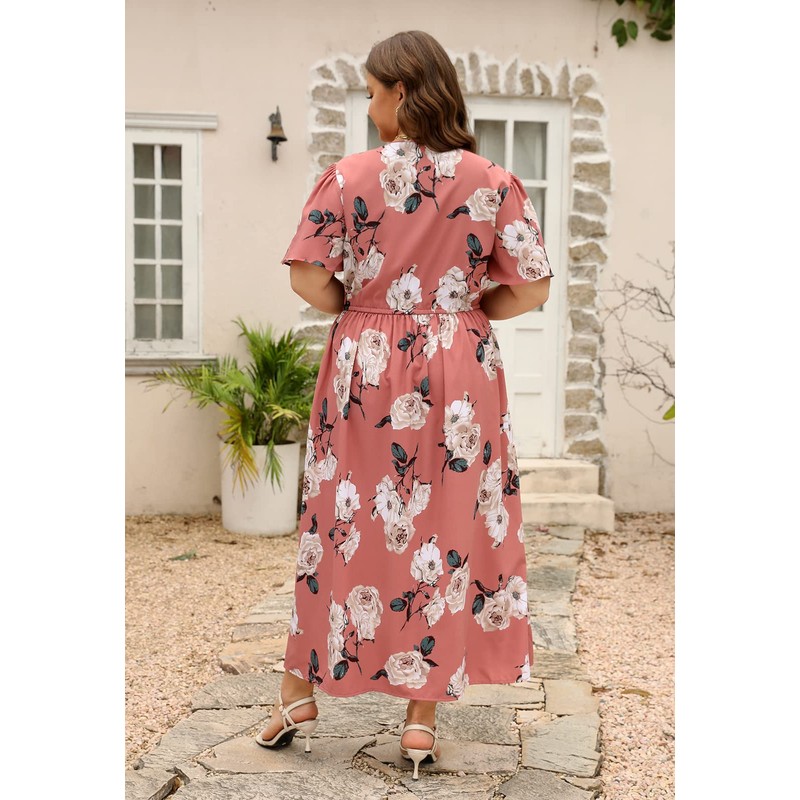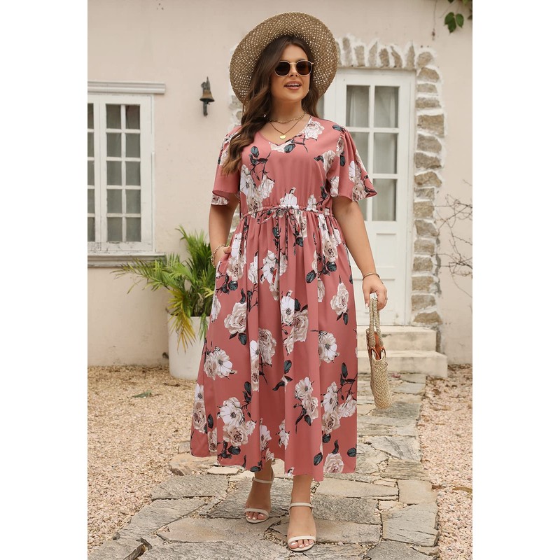 - Features: V neckline, maxi length, loose fit,elastic waist design with drawstring and you can adjust the waist size,which makes this dress elegant and flattering.This ditsy floral print boho long dress, relaxed a-line silhouette with Positioning pattern, lovely retro print dress for plus size ladies. The flutter sleeve is feminine and make you more comfortable. This flowy dress has 2 sides functional pockets at the skirt part and you can carry some necessities when you got out.