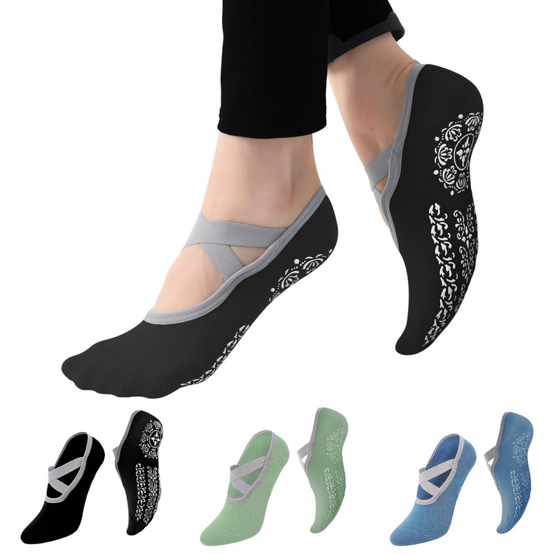 Experience ultimate comfort and stability during your yoga and pilates practice with these specialized non-slip grip socks. Each pack includes 3 pairs of stylish socks in beautiful black, blue, and green colors, designed to fit US women's sizes 7-10. The cotton blend material ensures breathability and comfort, while the distinctive cross-strap design adds both style and support. The bottom features an elegant mandala-patterned grip that prevents slipping on smooth surfaces, making these perfect for studio workouts, home practice, or any activity requiring sure footing. These ankle-length socks are machine washable (cold wash, tumble dry low) and maintain their shape and grip through regular use. The standard size offers a comfortable fit with just the right amount of stretch. Whether you're holding challenging poses or flowing through sequences, these socks provide the perfect balance of flexibility and traction for your practice.