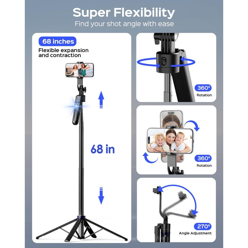 - 3-in-1 Tripod & Selfie Stick & Phone StandThis flexible selfie stick phone tripod transforms into a selfie stick, desktop tripod, and phone stand. It can be used on a desk or floor, lengthens up to 68 inches, and folds compactly for travel. Compatible with most smartphones, including iPhones and Android devices, it fits screens from 4 to 7 inches.