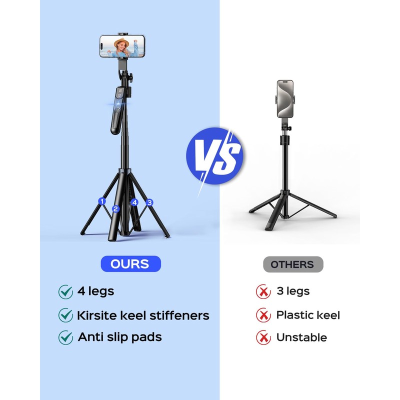 - Sturdy Four-Leg DesignComposed of high-quality aluminum alloy for lasting endurance and stability. With extended tripod legs and an umbrella-like skeleton structure, plus improved four-point support, metal ribs, and aluminum alloy telescopic rods, this tripod for iphone provides exceptional stability even during video recording. Perfect for those needing a tall tripod, selfie stick tripod with remote, or phone stand.