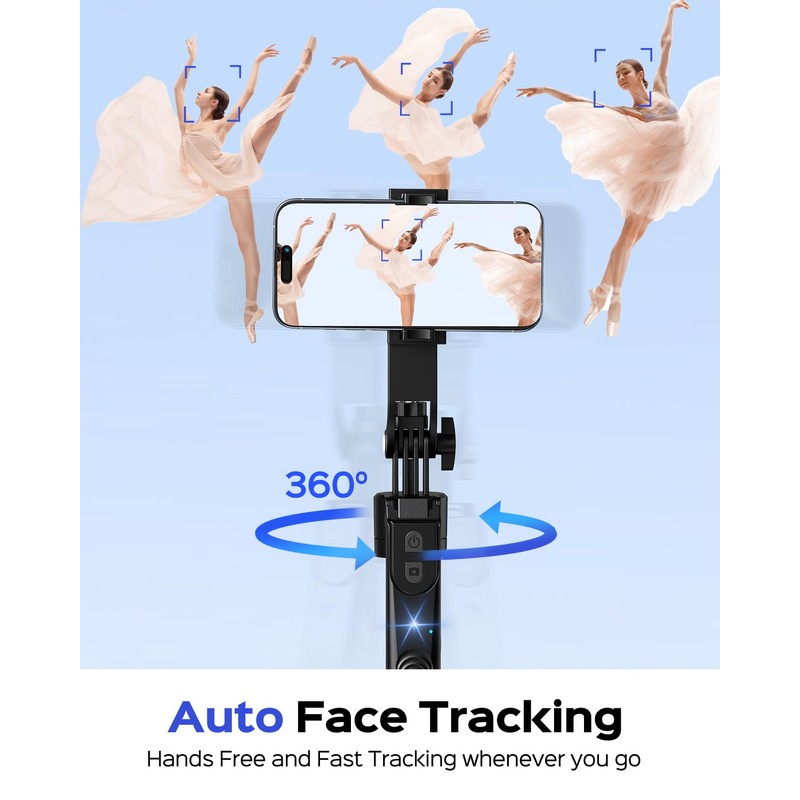 - 360 Auto Face TrackingThe Auto Face Tracking Tripod uses progressive AI technology and has successfully passed 5,000 intelligent sensor tests. Its highly sensitive design automatically follows and rotates with your face and body movements, assuring you remain centered on the screen.