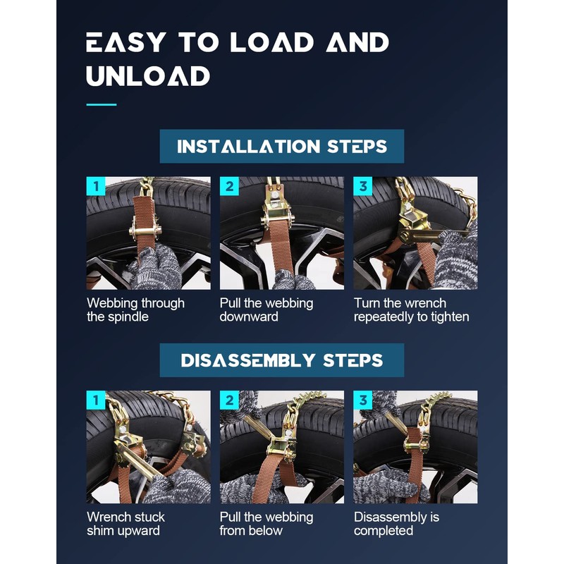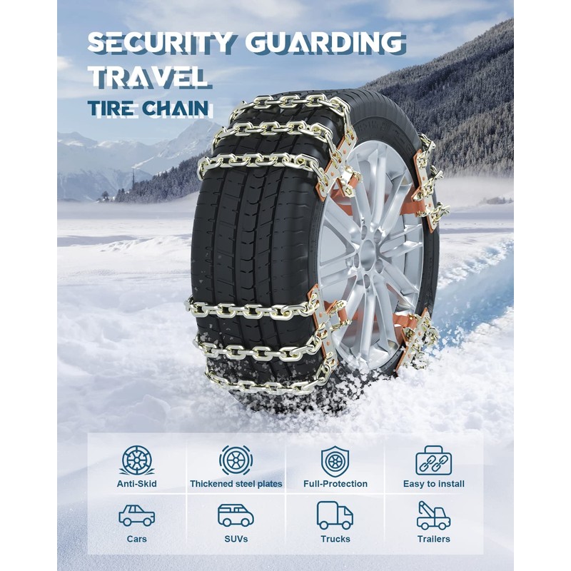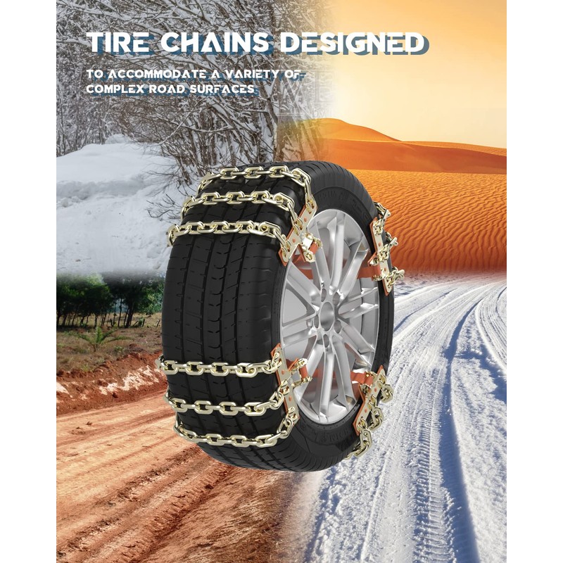 - 【Effective Anti-skid】Snow chains are firmly mounted on the tires, providing forceful traction and grip on smooth surfaces. No matter stuck in sand, mud and snow, the snow chains are equally effective