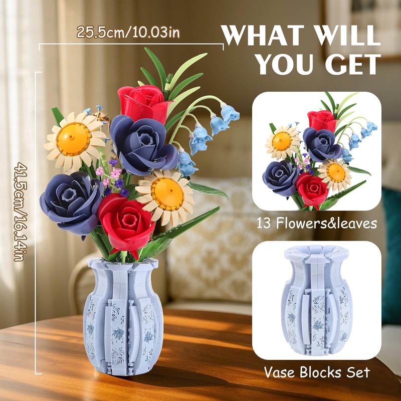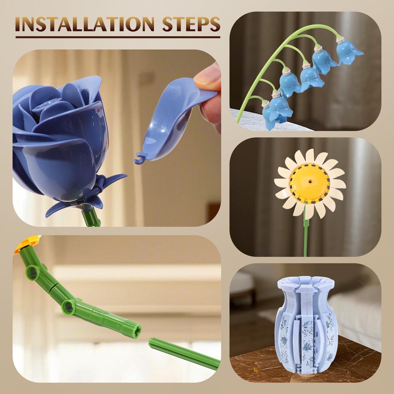 - DIY Your Unique Bouquet: This unique building block set features a ceramic-style modular vase, allowing you to freely customize the shape and height of your floral design. Complete with a detailed step-by-step guide, it’s perfect for adults and children to assemble, creating joy in a fun and relaxing atmosphere.