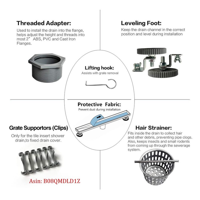 - 【Linear Shower Drain Accessories】 Open the Grate from both sides of the linear shower drain by using a lifting hook, the strainer can filter hair and particulate impurities effectively. Adjustable feet support the channel body during installation,can solve the installation problem effectively caused by the unevenness of the ground. Threaded Adapter joints with rubber ring to adjust the height of the drain.