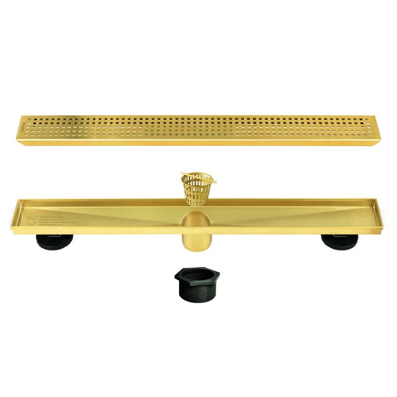 Neodrain 36-Inch Brushed Brass Linear Shower Drain with Removable Quadrato Pattern Grate,304 Stainless Steel Gold Rectangle Shower Floor Drain, Linear Drain with Hair Strainer