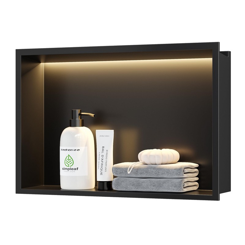 - Stainless shower niche black with LED tube. Size: 18"Length X12" Height X4" Depth. 100% leak-free and waterproof.3000K warm light.