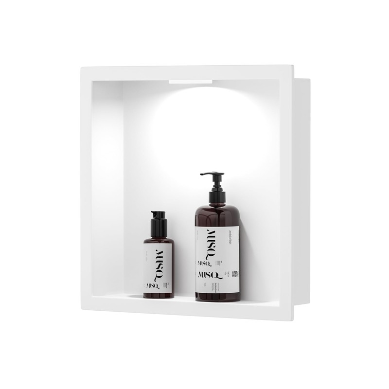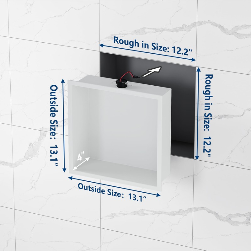 - Stainless shower niche White with LED light. Size: 4" Width x 12" Height x 12" Length. Can be installed horizontally. 100% leak-free and waterproof. 3000K warm light.