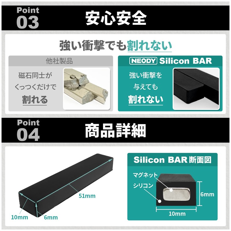 - (Strong Silicone Coated Magnets) The NEODY Silicon BAR magnet bar uses neodymium magnets that are made with silicone processing, so they don't rust, and are made of silicone that won't break or break