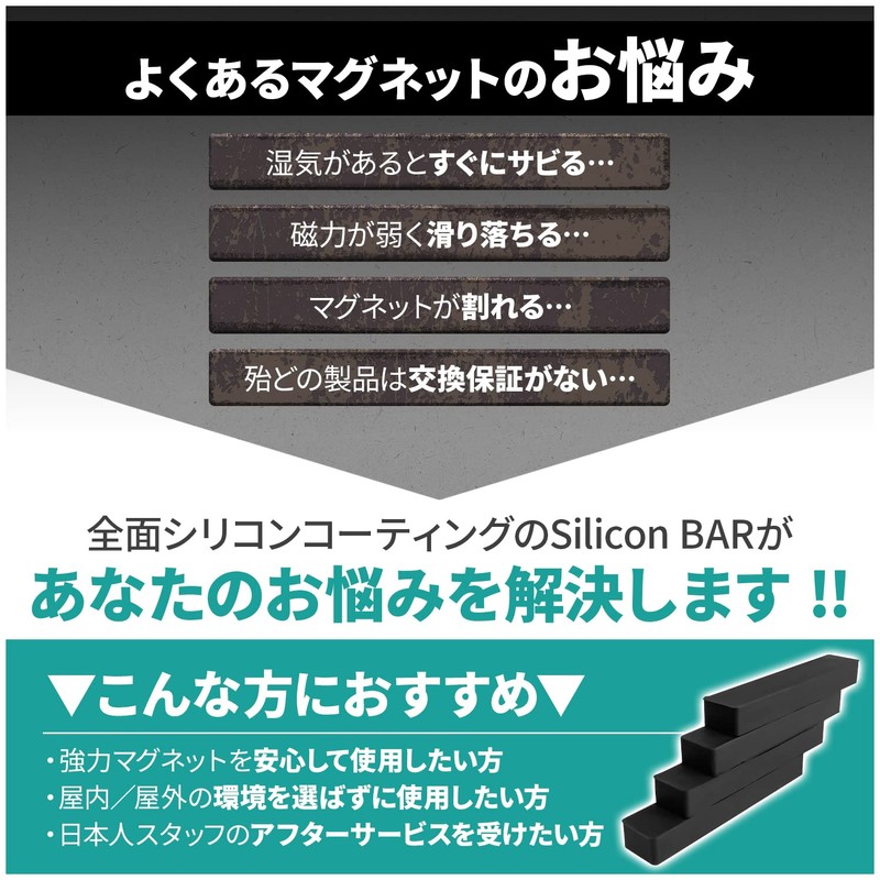 - (Silicone Processing, Rustproof, Crackproof, Safe to Use) Traditional strong magnets have not been able to withstand strong magnetic forces and broken quickly, but Silicon BAR solves the weak points of neodymium magnets in terms of durability. No need to worry about rusting, cracking, or just keep it off the adhesive. From now on, you will be free from those worries and you can use a strong magnet for peace of mind