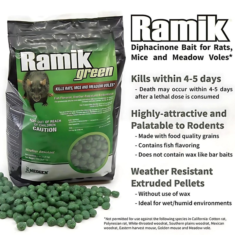 • EFFECTIVE INGREDIENTS: Neogen's Ramik Rodenticide products are made of a first generation anticoagulant, diphacinone (.005%)