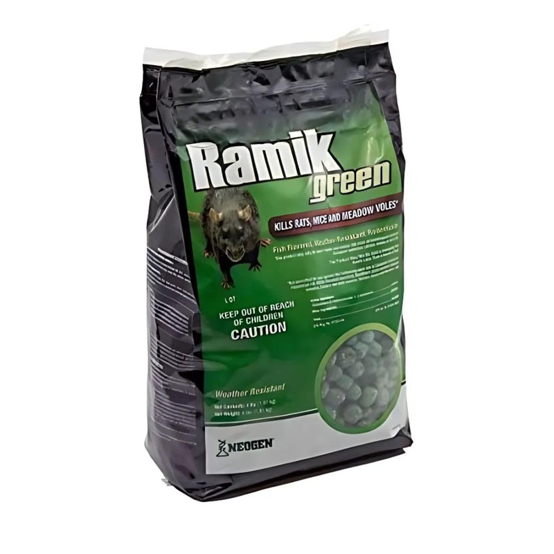Neogen Ramik Green fish flavored weather-resistant, heat-extruded rodenticide Pellets, 4 lb Bag is a bait that uses food processing technology to produce an attractive fish flavored bait that retains its freshness, sweetness, and effectiveness in a long-lasting pellet form. Pellets are hot-extruded, so they are a weather-resistant bait made without the use of wax and can be used indoors and outdoors. Made with an anticoagulant active ingredient, Diphacinone. Ramik Green is part of Neogen's 4-step rodent control program. This product may only be used to control the following rodent pests in and around man-made structures: House mouse (Mus musculus), Norway rat (Rattus norvegicus), Roof rat (Rattus rattus), Cotton rats (Sigmodon hispidus), Eastern harvest mouse (Reithrodontomys humuli), Golden mouse (Ochrotomys nuttalli), Polynesian rat (Rattus exulans), Meadow vole (Microtus pennsylvanicus), White-throated woodrat (Neotoma albigula), Southern plains woodrat (Neotoma micropus), and Mexican woodrat (Neotoma mexicana). Not permitted for use against the following species in California: Cotton rat, Polynesian rat, White-throated woodrat, Southern plains woodrat, Mexican woodrat, Eastern harvest mouse, Golden mouse, Meadow vole. Neogen's proven line of rodenticides, bait blocks and bars, and pellets is used for effective control of rodent infestations and is often a critical component of an overall biosecurity plan.