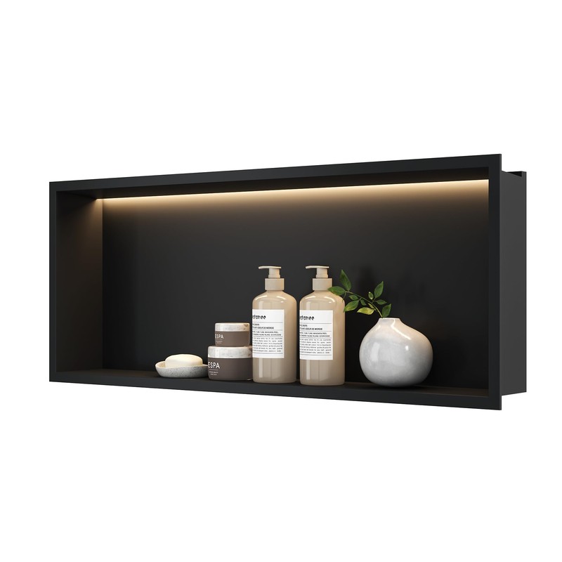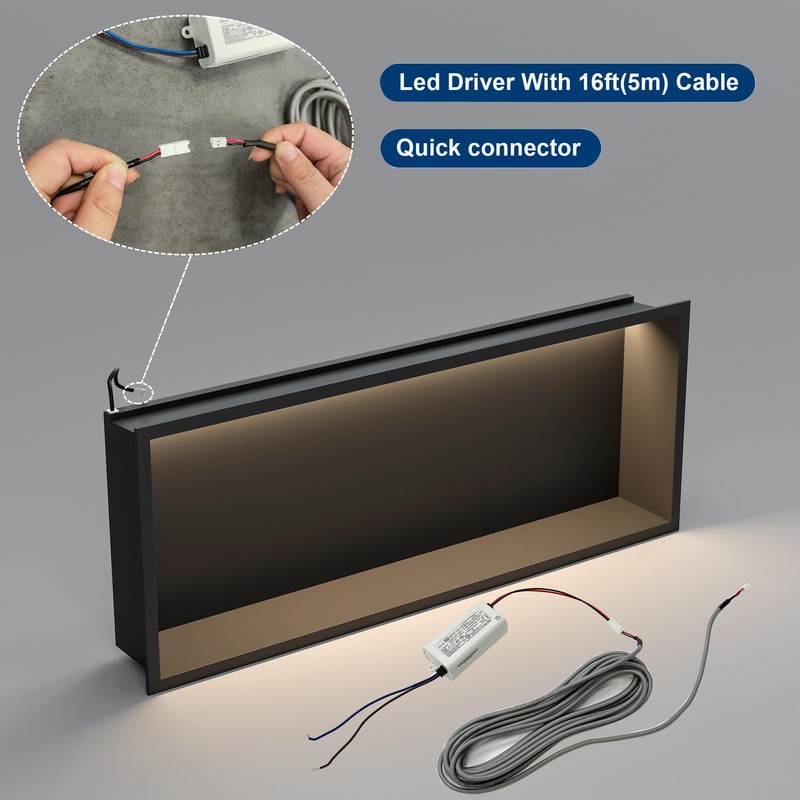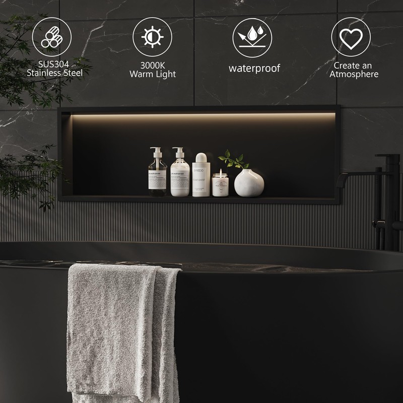 - ✅Black Recessed Shelf with Light. Inner size 30"Length X 12" Height X 4" Depth, Non-dimmable 3000K warm light. 100% waterproof. LED driver and16ft power cord included. The lights on this model with non-dimmableare, but Led light available for dimmer switch.