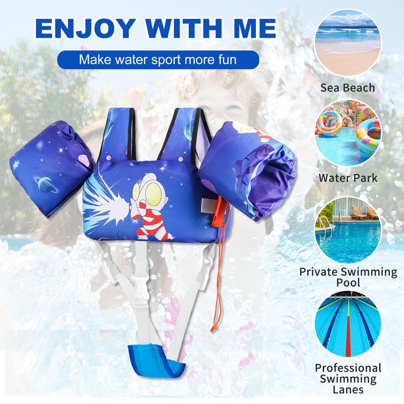 - SAFETY & RELIABLE DESIGN: The toddler swim vest is designed with adjustable cross double straps and non-slip openings with safety buckles attached to the child's back so that the child can't open it alone, keeping the child as safe as possible. And the toddler floaties is equipped with an emergency whistle, which can be blown if the child encounters an unexpected situation during play, so as to attract parents' attention in time