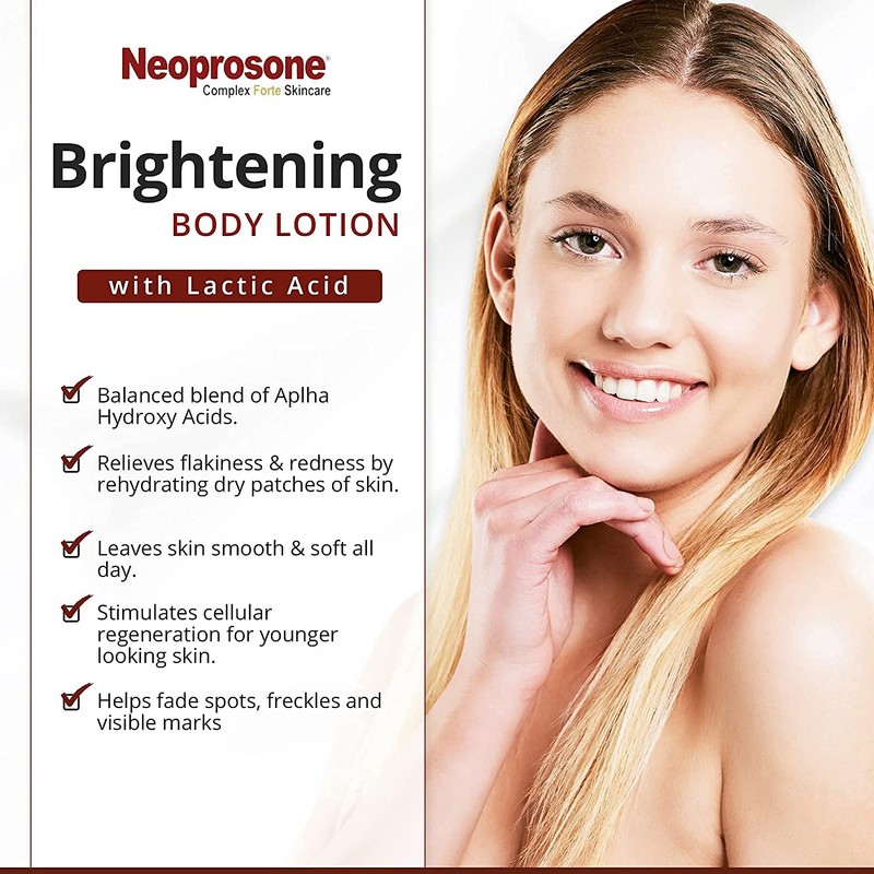 - FORTE SKIN CARE: Neoprosone Brightening Body Lotion restores an even skin tone thanks to the potent brightener Arbutin Complex and deep hydrating agents.
