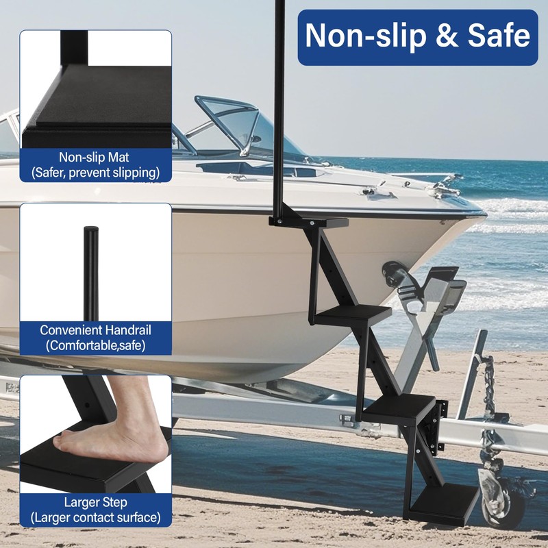 - Non-Slip & Safe Access: The boat trailer steps for the tongue are equipped with non-slip mats and a handrail to reduce the risk of slipping when getting in and out of your boat; In addition, each step size is 7.1" x 11.8", providing a larger foothold, ensuring safety and comfort