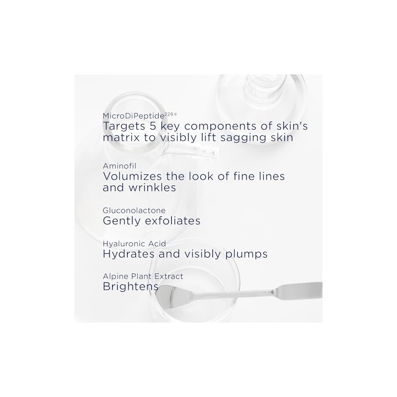 Target your signs of aging in three ways with our most powerful antiaging serum, formulated to visibly volumize, hydrate and brighten your skin for an intensely renewed, firmer look. Now featuring breakthrough MicroDiPeptide229® – our patented micro-sized lifting and firming peptide technology, with a supercharged formula of Hyaluronic Acid, Aminofil, Gluconolactone and Alpine Plant Extract Complex.