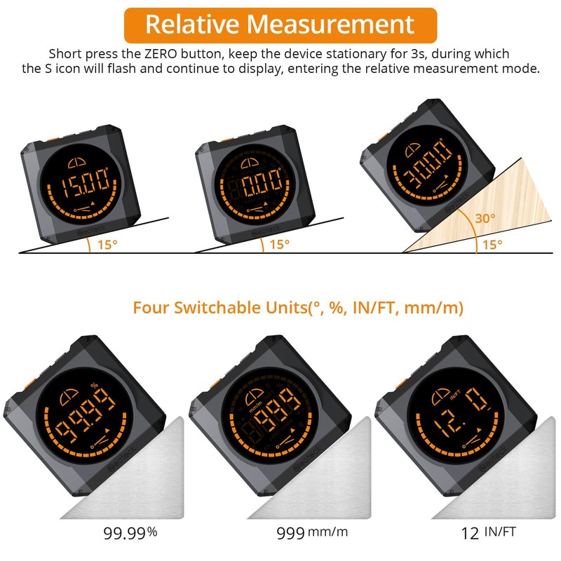 - 【Accurate & Reliable】The Upgrade Angle Finder Features Measuring Range: 4*90°/2*180°, Accuracy: +/- 0.1 Degrees At 0 And 90 Degrees And +/-0.2 Degrees The Remainder. Zeroing (Relative/Absolute Measurement), Data Hold, Reading Flip, And Four Measurement Units (°, %, In/Ft, Mm/m) For Setting Or Checking Relative Angles Between Surfaces, Also Working As True Digital Level For Tight Spots