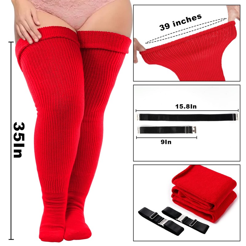 - Extra Tall& Wided& Oversize: Heel to Top Length is about 35'', and the stretched length is up to amazing 42'', The width is about 7", and the stretched width is up to amazing 39". Recommended: For upper thighs that measure 27 inches or larger. Say goodbye to Asian sizes, our thigh high socks is tailored for European and American big girls.