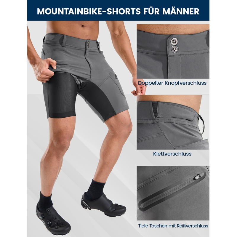 - ELASTIC & COMFORTABLE:The high elastic fabric in the crotch area ensures a good wearing experience and helps to wrap the muscles of the buttocks and thighs, which helps to protect the movement muscles. These MTB shorts with padding have plenty of room for your valuables with 2 deep pockets and zip pockets for secure storage. Reflective logo on the zip pockets help keep you safe on early morning or evening rides.