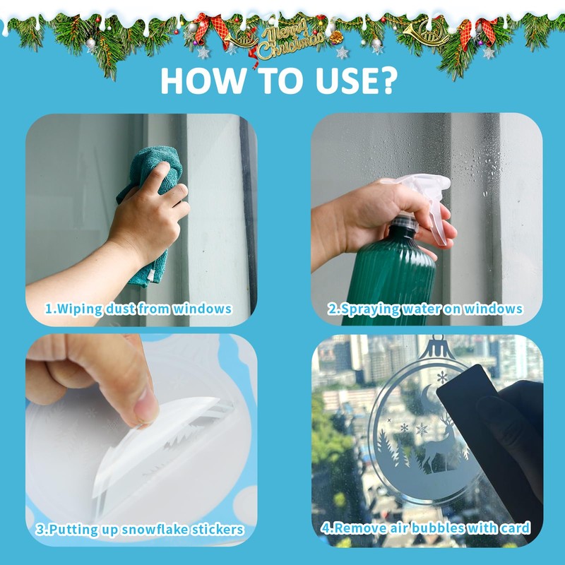 - ❄️EASY TO USE CHRISTMAS STICKERS: Christmas window stickers use the electrostatic adhesion principle and do not require adhesives or tapes. No marks or residue! Very easy to peel, place or change the layout of the stickers on the windows to achieve the desired effect. Tip: a little spray of water before sticking will make it stick more firmly!