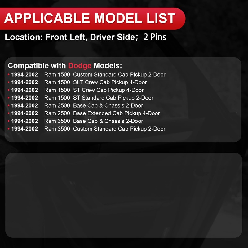 - Directly Fit :Compatible with Front Left Driver Side,Can be Direct Replacement OE parts, 2 Pins ;only fit Cab Pickup