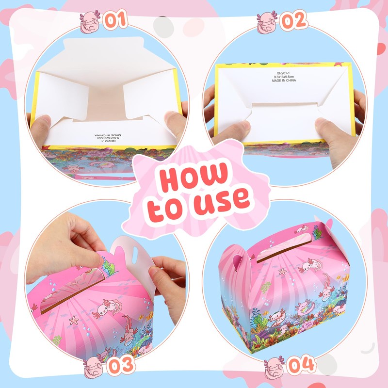 - Practical Axolotl Birthday Party Boxes: These axolotl candy boxes measures 6.3x3.5x3.5 inches/ 16x8.89x8.89 cm, which provide you with enough space to place all kinds of things, such as candies, cookies, toys and other gifts. And it is design with handles holds, convenient to carry.