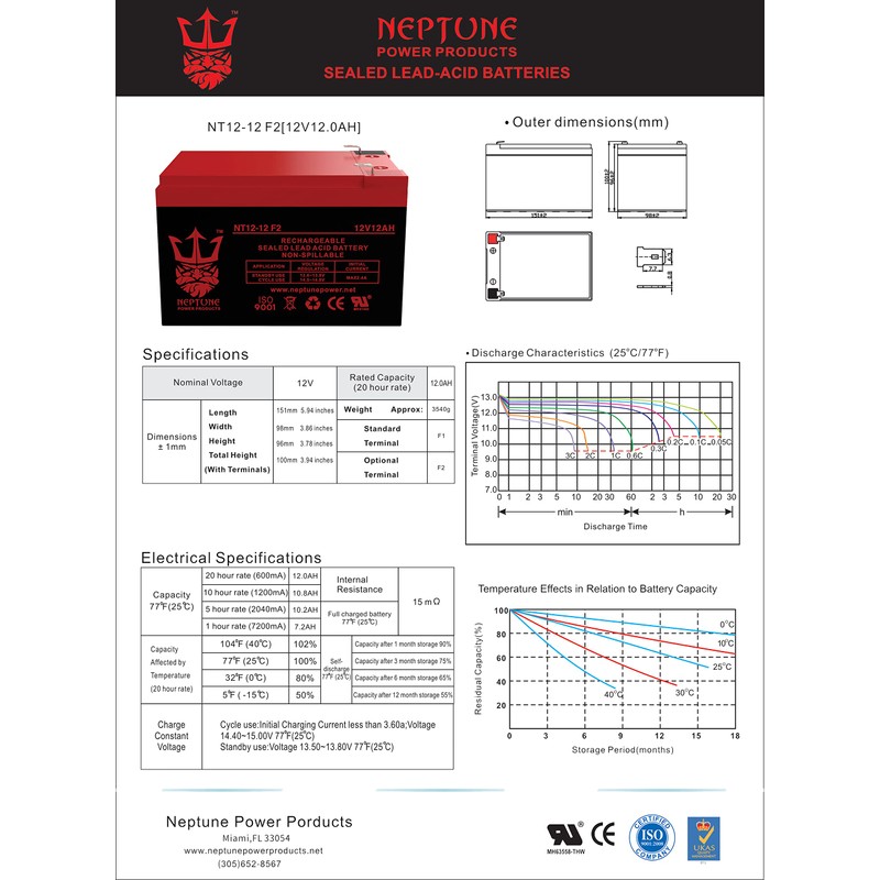 12 Volt 12 Amp-Hour Sealed Lead Acid (SLA) batteries with F2 Terminals by Neptune Power Products are constructed with lead calcium alloy and absorbed glass mat AGM technology which allows a completely maintenance-free and high-performance operation. Fiberglass mat separators and high cell compression extend battery life by delivering superior vibration resistance from the most extreme conditions. All 12V 12Ah Neptune brand AGM batteries are manufactured with the highest quality materials and rigorously tested to ensure safety, OEM compatibility, effectiveness and optimal performance.