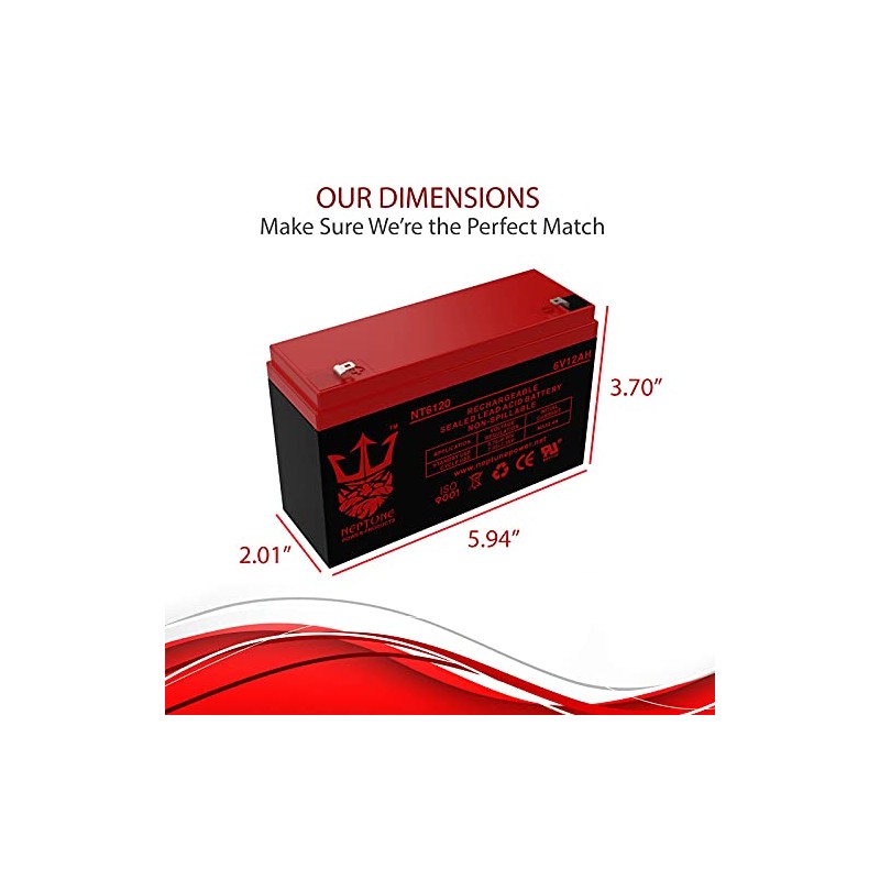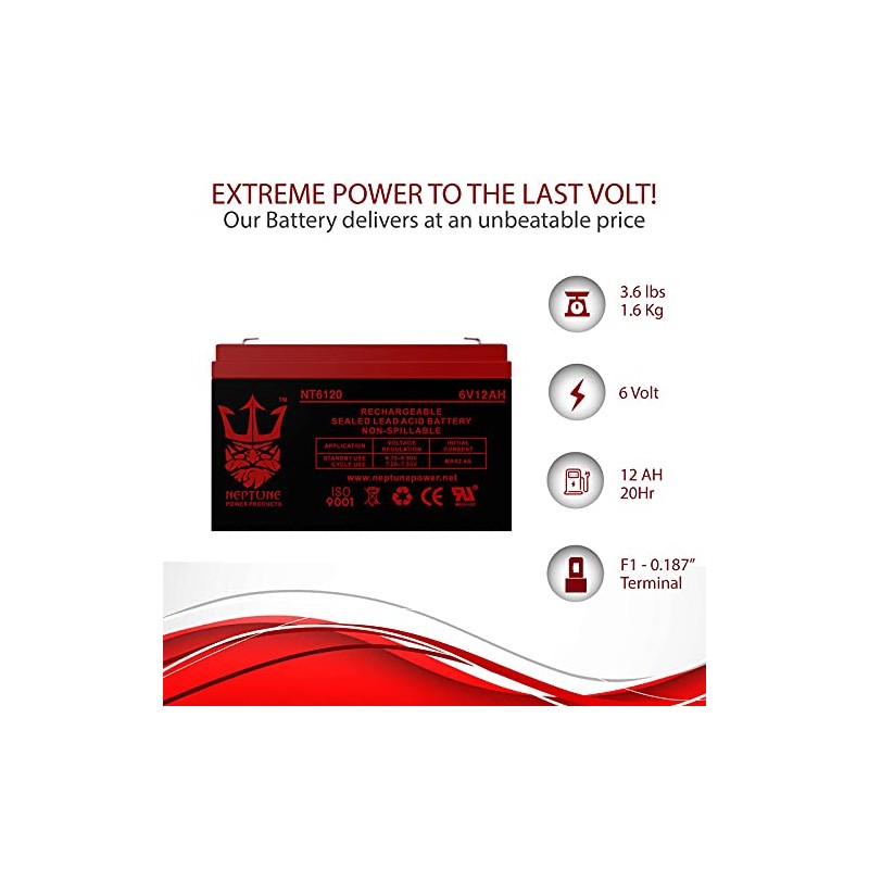 • Neptune Brand NT6120 is a 6V 12AH Sealed Lead Acid (SLA) rechargeable maintenance free battery - UL Certified. Neptune batteries are Engineered and Manufactured to Meet or Exceed OEM Original Manufacturers Battery Specifications. We are not associated with Other Battery Brands or Manufacturers Stated Popular Products. We supply only Brand new, Factory Fresh, high-quality Batteries.