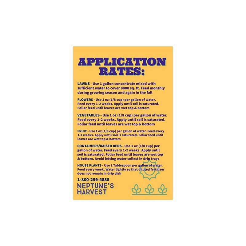 Neptune's Harvest Seaweed Plant Food is an organic storehouse of over 60 naturally occurring major and minor nutrients and amino acids. It's growth promoting substances (Auxims, Cytokinins, Gibberellins) enhance plants development, color and vigor. Seaweed has also been found to increase plant hardiness and resistance to adverse environmental conditions, such as early frost, extreme heat and lack of moisture. Used as a seed inoculant, seaweed fertilizer increases and accelerates germination, and enhances the rapid development of a healthy root system. Seaweed is an excellent additional to any fertilizer program. Directions: Shake well before using. Prepare for one application only. Do not store diluted fertilizer. House Plants: Use 1 tablespoon per gallon of water. Feed every 2-3 weeks. Do not over water. Outdoor Plants: Use 1/8 Cup (1 fl. Oz.- 1:128) per gallon of water. Feed vegetables, flowers, trees and shrubs every 2-3 weeks. Apply until soil is saturated or as a foliar feed until leaves are wet, top and bottom. It is best to foliar feed early or late in the day. Lawns: Use 1 gallon concentrate mixed with sufficient water to cover 8000 sq. ft. Feed monthly during growing season and again in the fall. Compost Enhancer: Use 1/4 Cup (2fl. Oz.) per gallon of water every 2-3 weeks. Seed Germination: Soak in solution of 1 teaspoon per cup of water. Neptune's Harvest Seaweed Fertilizer is offered in a convenient 1 gallon container.