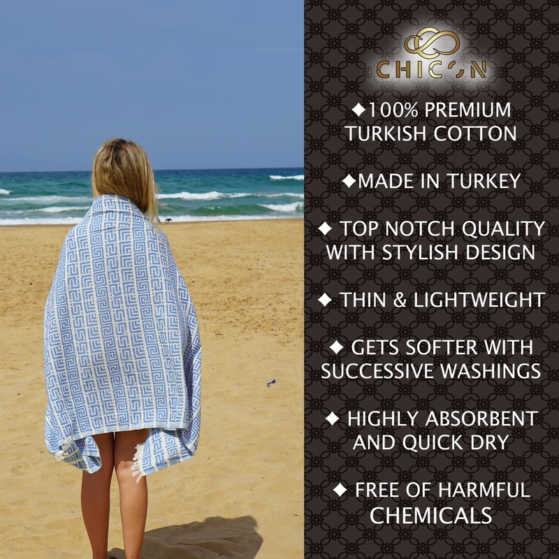 NERENZA CHICON Premium Turkish Beach Towel Cotton Peshtemal - Stylish Turkish Bath Towels extra large Blanket for Beach and Bathroom - Prewashed - 36 x 70 Inch XL - Maze Light Blue (1 unit)