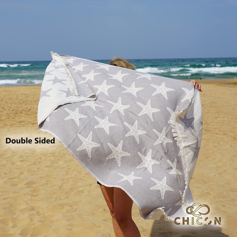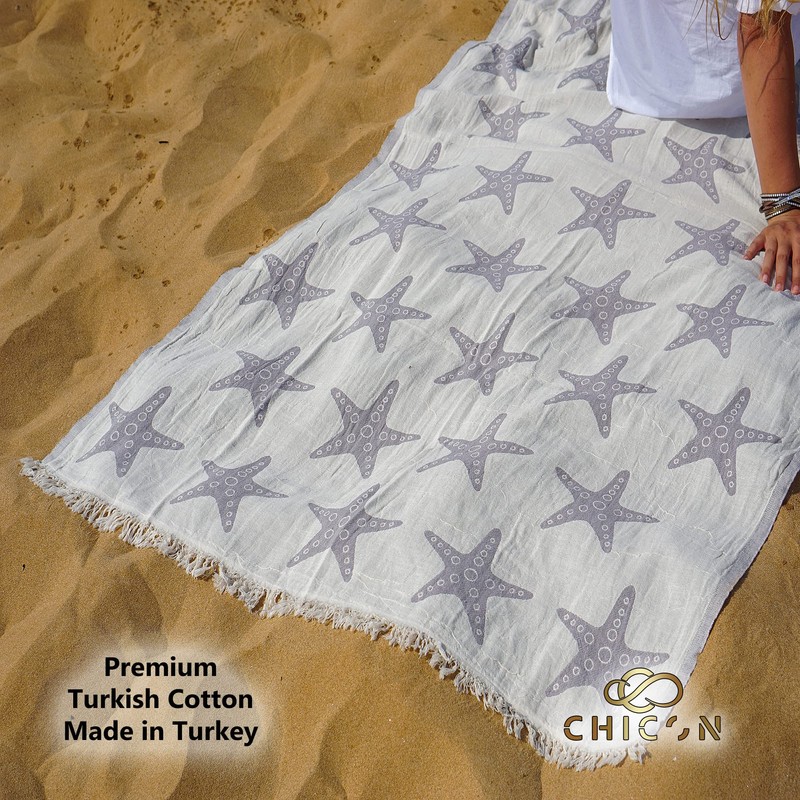 NERENZA CHICON Premium Turkish Beach Towel Cotton Peshtemal - Stylish Turkish Bath Towels extra large Blanket for Beach and Bathroom - Prewashed - 36 x 73 Inch XL - Starfish Light Grey (1 unit)