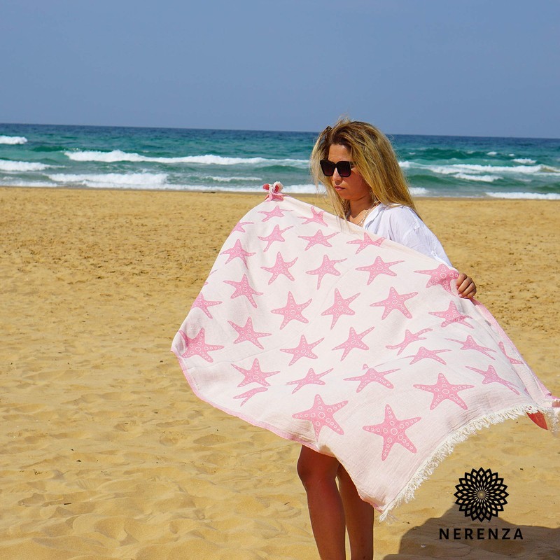 NERENZA CHICON Premium Turkish Beach Towel Cotton Peshtemal - Stylish Turkish Bath Towels Extra Large Blanket for Beach and Bathroom - Prewashed - 36 x 73 Inch XL - Starfish Pink (1 Unit)