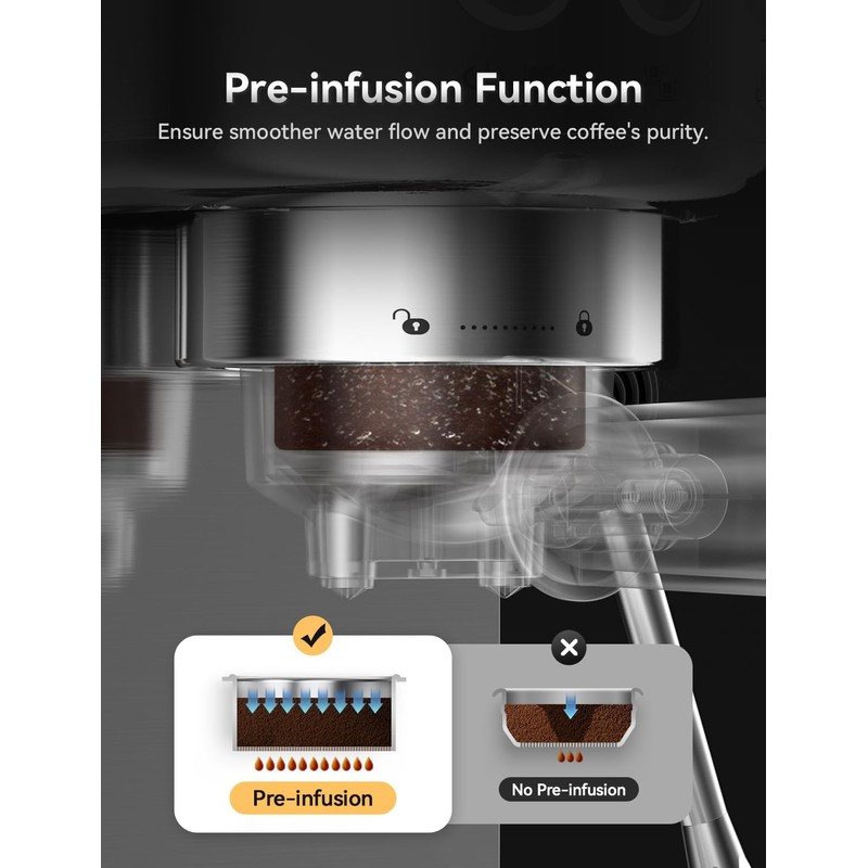 - PRE-INFUSION FUNCTION - Neretva espresso coffee maker has Low pressure pre infusion, which gradually increases pressure at the start and effectively reduces air bubbles generated during the extraction process. It helps to ensure all the flavors are drawn out evenly during the extraction for a balanced tasting cup.
