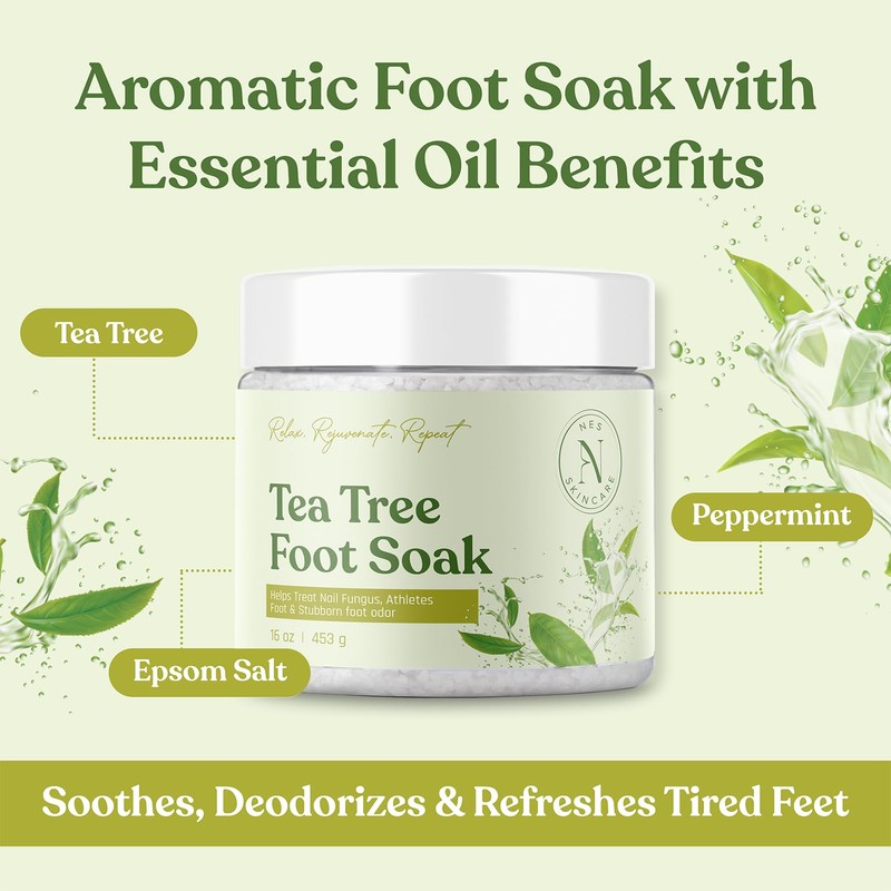 NES Skincare Tea Tree Foot Soak, 16 oz, with Peppermint and Epsom Salt for Nail Fungus and Athletes Foot