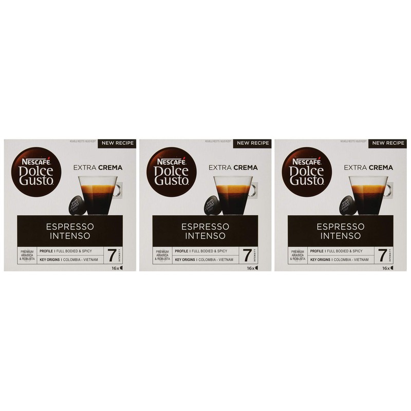• You receive 3 boxes, each one containing 16 espresso intenso coffee pods designed for NESCAFE Dolce Gusto capsule coffee machines, a total of 48 espresso capsules.