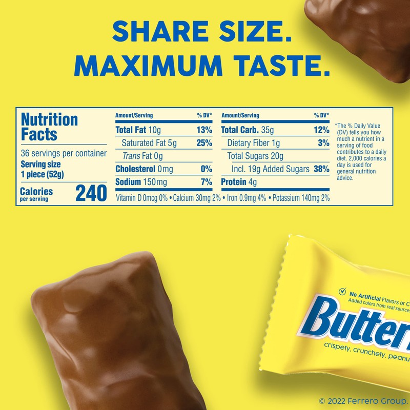 - THE TASTE YOU LOVE: Perfectly irresistible, our Butterfinger Share Size candy bars have the same crispety, crunchety, peanut-buttery taste you know and love from our classic Full Size candy bars, just in a share size