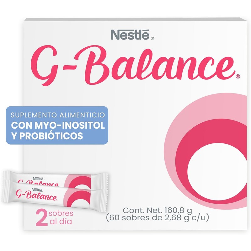 Nestlé G-Balance es un suplemento alimenticio en polvo diseñado para apoyar la salud metabólica, hormonal y digestiva de forma integral. Su fórmula combina myo-inositol, un nutriente clave en la regulación hormonal y metabólica, con probióticos que favorecen el equilibrio de la flora intestinal y el bienestar digestivo. Ideal como apoyo en mujeres con desequilibrios hormonales o metabólicos, G-Balance se presenta en sobres individuales de fácil disolución, perfectos para llevar contigo y tomar en cualquier momento del día. Con 60 sobres de 2.68g cada uno, ofrece un suministro completo para 1 a 2 meses, dependiendo de tu régimen. Su sabor neutro permite mezclarlo fácilmente en agua o jugos sin alterar su sabor.