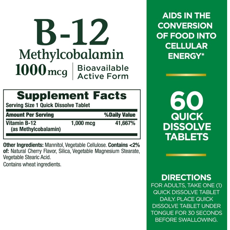 - FOR ENERGY: 60-count, Vitamin B-12 1000mcg Tablets. Nature’s Bounty Quick Dissolve B-12 vitamins play an important role in energy metabolism in the body (1); They help the body convert food into the fuel which is used to produce cellular energy in the body(1)