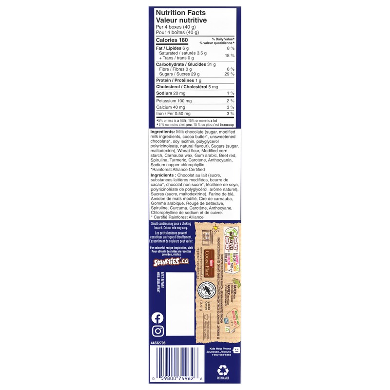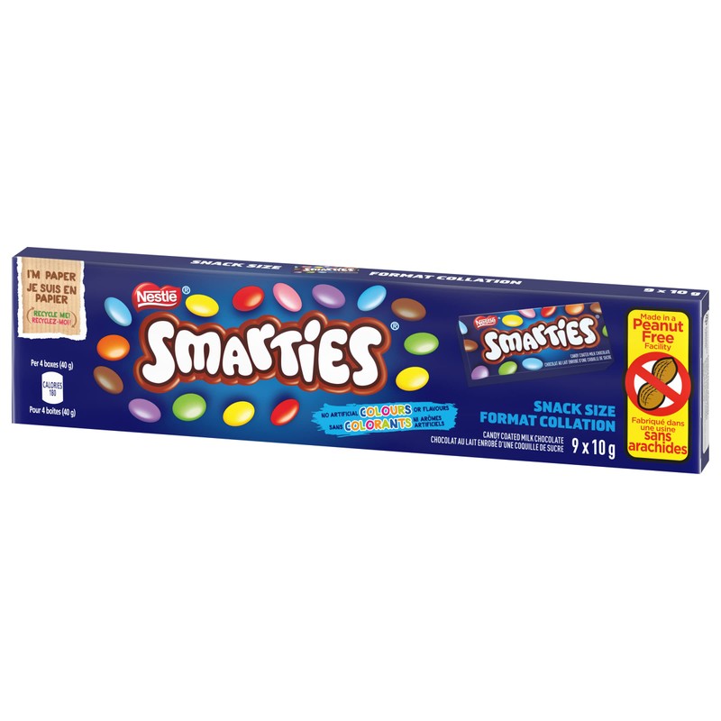- 9 miniature boxes of SMARTIES, colourful candy-coated pieces of milk chocolate
