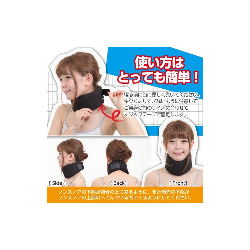 • 【使い方】就寝時に首に巻き、顎が外部に出るよう、呼吸が苦しくない程度にマジックテープで留めそのまま就寝いたします。顎が下がりにくくさせると同時に、顎が頭の重さと、コルセットに挟まれ閉まるので、鼻呼吸ができるようになります。