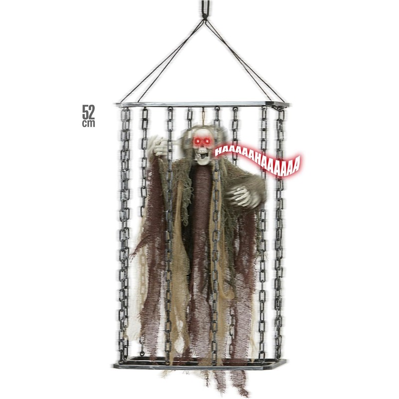 • What makes our Grim Reaper in the cage Halloween decoration so special? It makes your horror party unforgettable and gives your decoration that certain something. With its luminous eyes and sound effects, it creates a scary atmosphere that will captivate your guests. Whether you use it for Halloween or theme parties, this zombie is the highlight of any scary party.