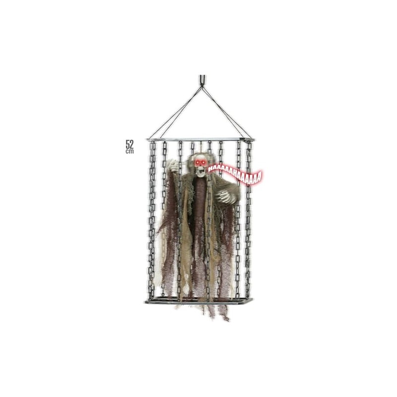 • If you are looking for a scary party decoration for Halloween, theme parties or other creepy occasions, then our Grim Reaper in cage in black with a size of 52 cm is the perfect choice. This zombie with luminous eyes and sound effects will frighten your guests and make your party unforgettable.