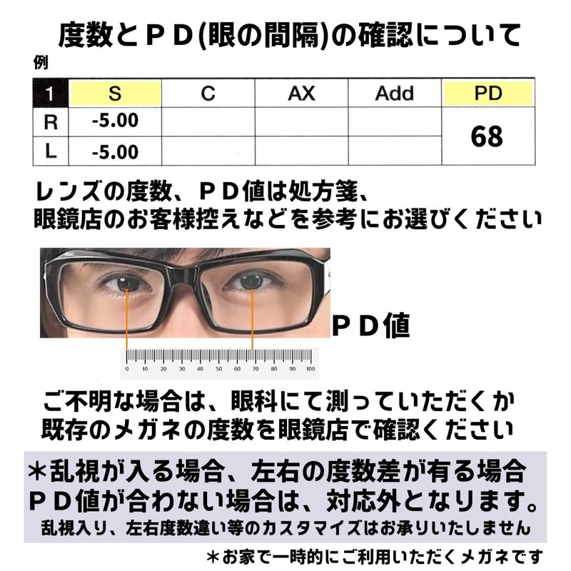 • 【度数とPDをお選びいただきご注文下さい】サイズ項目から「度数」を、色項目から「PD(瞳孔間距離)」をお選びの上、ご注文下さい。《PDとは?》右の瞳孔(黒目の中心)と左の瞳孔(黒目の中心)間の距離を言います(単位mm)眼科さんにて測っていただくことができます。度数とPDをしっかりお選びいただくと、レンズの性能を最大限に活かしたすばらしい見え方を実感いただけます。(あいまいな場合は、調べてからご注文下さい)