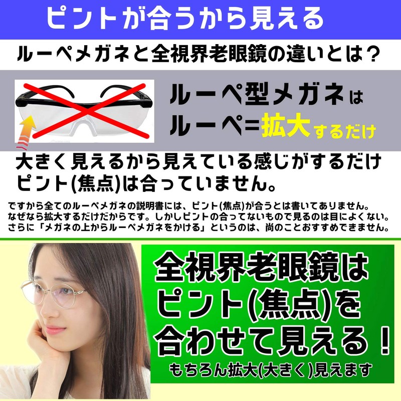 - 【ピントが合うから見える全視界老眼鏡】 今流行りのルーペメガネは、「メガネ」とありますが、メガネではありません。ルーペすなわち拡大鏡です。虫眼鏡と同じです。拡大して大きく見えるから、よく見えている感じがするだけです。メガネに必須のピント(焦点)を合わせる機能はありません。分類としては拡大鏡(虫眼鏡)の為、視力補正に必要な「一般医療機器」としての届け出がされていません。貴方がご使用のルーペメガネには一般医療機器の届け出番号が明記されていますか?一度確認されることをおすすめします。「全視界老眼鏡」は視力補正用の一般医療機器メガネレンズとしての承認済、ピントが合い、見やすさをサポートする視力補正用のメガネです、安心してご利用ください。
