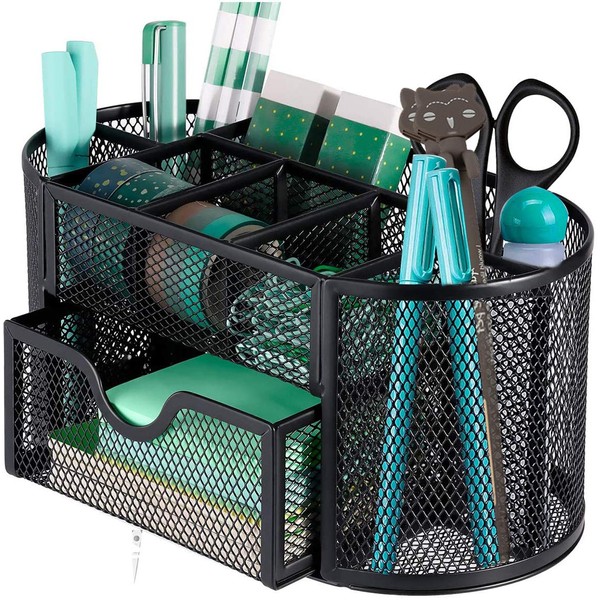 • All-in-one office desk organiser: Netume black metal desk organiser features 4 pen holders, 4 compartments and 1 drawer. It is perfect for keeping your desk tidy. 4 pen holders allow you to separate highlighters from pens. It is also suitable for scissors, rulers, staplers, and brushes. The several open compartments and a drawer are practical for small items such as erasers, ink cartridges, pins, tape, post-its, etc.