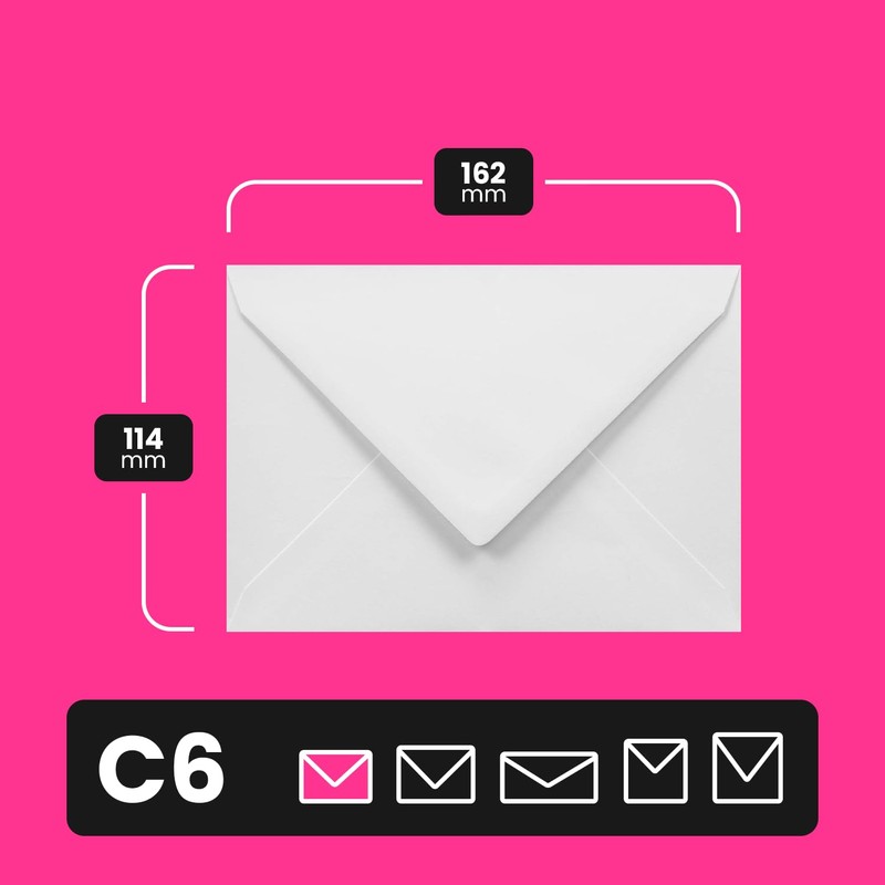 • TECHNICAL DATA - 100 white envelopes in C6 format: 114x162mm/4.49x6.38 inches; gummed pointed flap; no window. Made of matt white 100gsm paper. Possible slight colour deviations depending on individual monitor setting, and between each envelope.