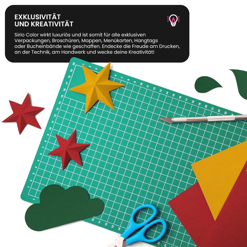 - EXCLUSIVITY AND CREATIVITY - Sirio Color looks luxurious and is therefore perfect for all exclusive packaging, brochures, folders, menu cards, hangtags or book covers. Its haptic and visually exciting surface inspires creative paper ideas.